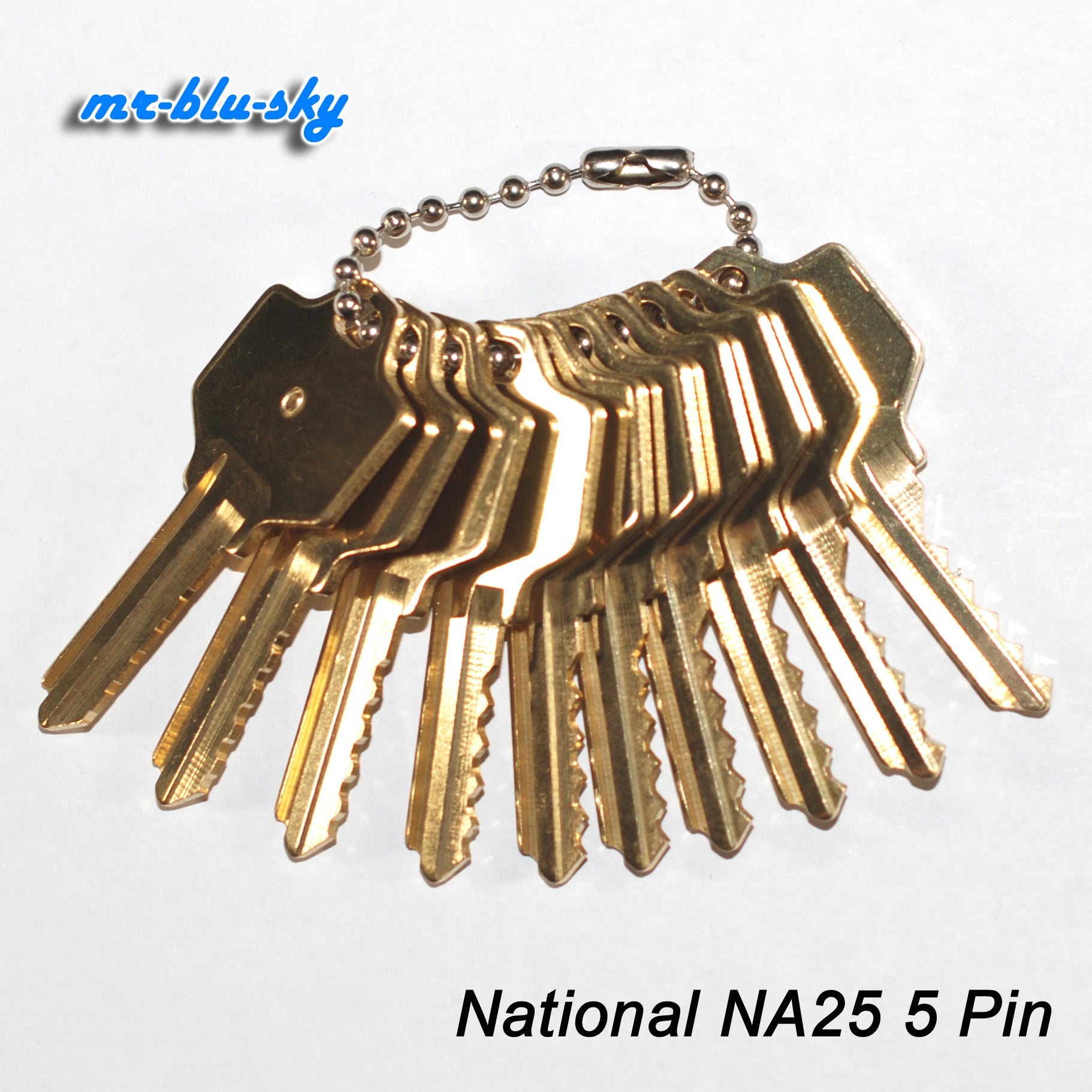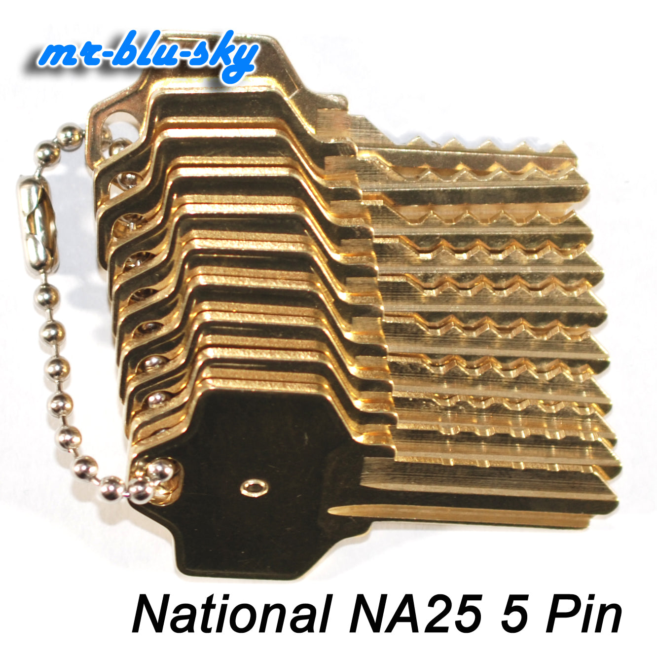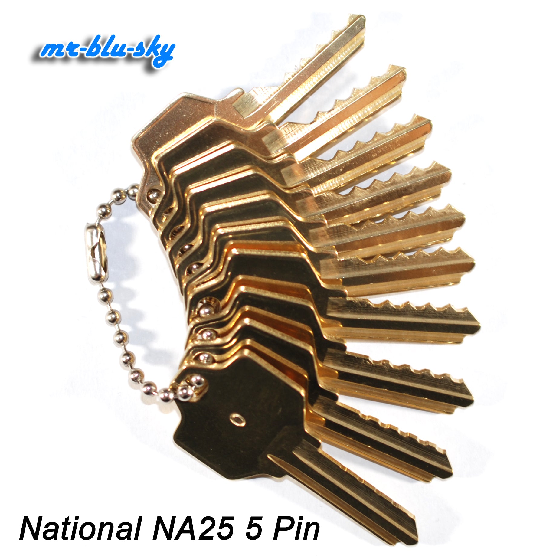 A precisely cut and highly popular set of National Lock NA25, NA6, Pin Space and Depth Keys, crafted for use in pin tumbler locks. Each key is individually stamped with a code number, making them ideal for use with a key duplicator to create keys by code.
